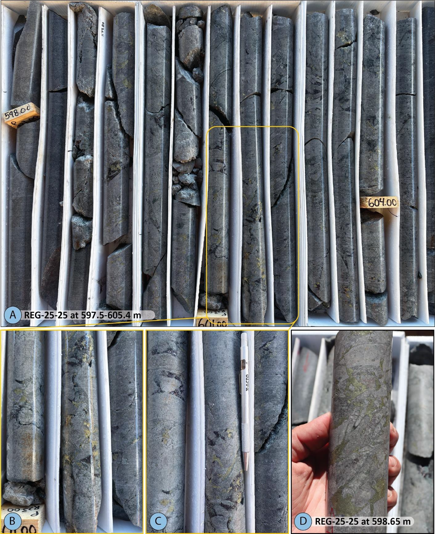 Close up photos of stronger sections of mineralization from REG-25-25 are shown in Figure 1. We currently do not have analytical results for the intervals from the 2025 drill program, so caution is warranted in comparing the potential assay quality of these intersections to REG-22-01, REG-23-14 and REG 23-21. However, in terms of geology, alteration, mineral species and abundance, the zones appear to compare favorably. For comparative purposes, mineralized intervals and their corresponding assays can be found in press releases dated February 23, 2023 and November 2, 2023.