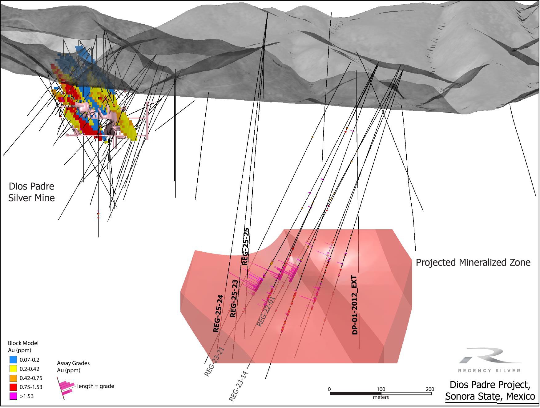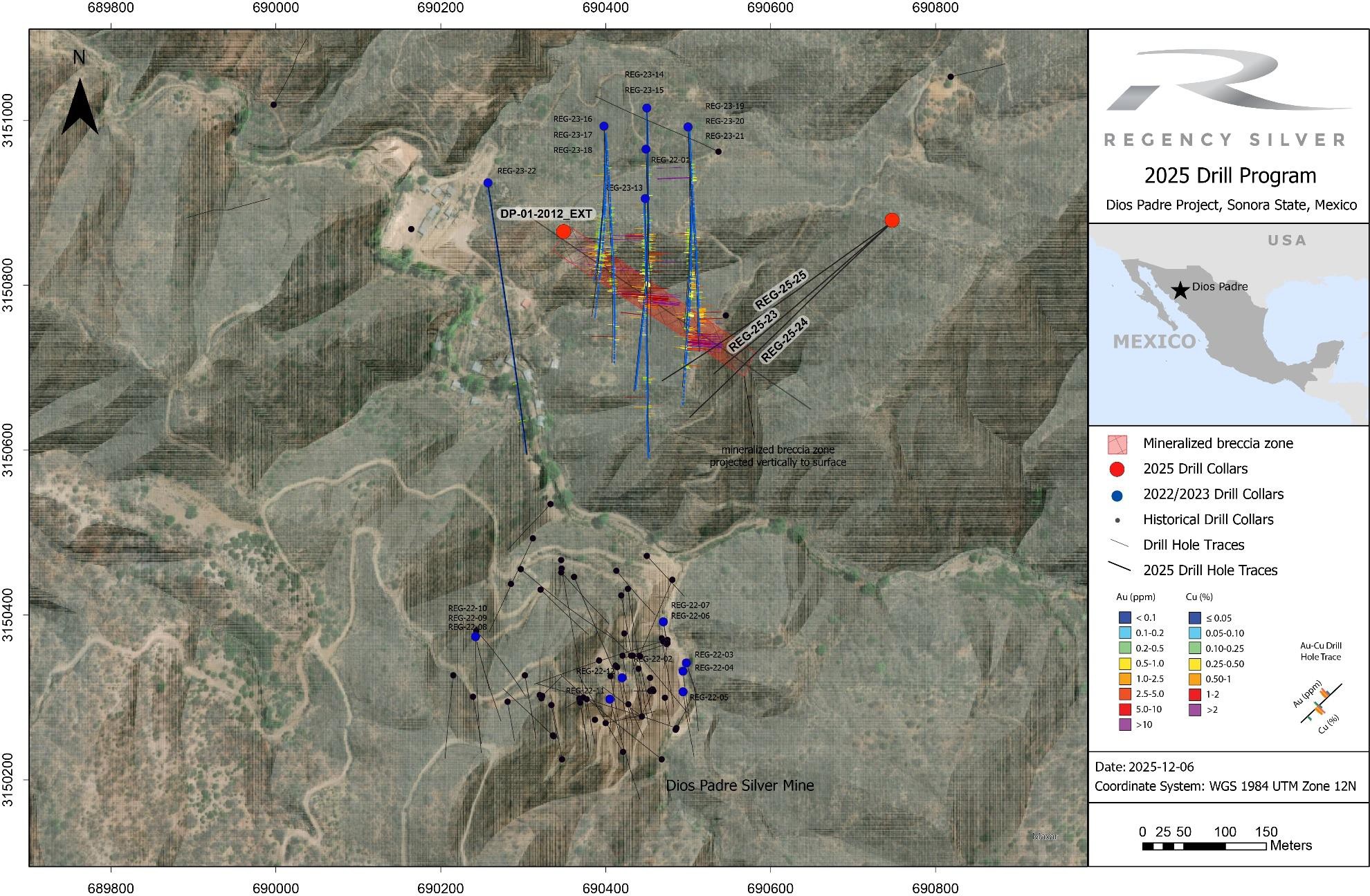 Vancouver, BC – December 8, 2025 – Regency Silver Corp. (“Regency Silver” or the “Company”, TSXV-RSMX and OTCQB-RSMXD) is pleased to announce that follow up hole REG 25-25 has intersected 23.7 m of sulphide-specularite supported breccia (Figure 1) similar in nature to the breccia hosting high grade Au-Cu-Ag mineralization in REG-22-01, REG 23-21 and REG 23-14. The intersection is ~35m up dip and along strike to the Southeast from drill hole REG 23-21. REG 23-21 yielded 38m of 7.36 g/t gold, REG-22-01 yielded 35.8 metres of 6.84 g/t gold, 0.88% copper and 21.82 g/t silver, and REG 23-14 yielded 29.4 m of 6.32 g/t gold.